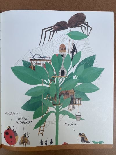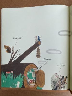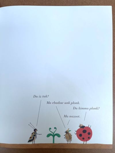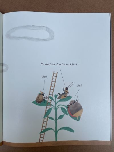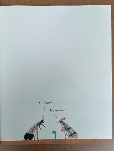 แวบแรกที่เห็นหนังสือนิทานเล่มนี้หลายคนคงอดคาดเดาไม่ได้ว่าน่าจะเป็นนิทานภาษาเยอรมัน… หรือเปล่า? และถึงจะให้เดาต่อไปก็คงไม่มีใครคาดคิดหรอกว่าแท้ที่จริงแล้วผู้แต่งตั้งใจจะเขียนออกมาเป็น ‘ภาษาแมลง’ เพราะด้วยศัพท์แสงและไวยากรณ์ที่ถูกประดิษฐ์ขึ้นให้คุ้นตา แต่ทว่าเมื่อได้ลองอ่านดูเรากลับไม่รู้ความหมายจริงๆ เลยสักตัว ทำได้แค่มั่วๆ ไปพอให้ได้เข้าใจอยู่ ผู้ใหญ่หลายคนรู้สึกไม่สนุกเพราะแปลไม่ออก อาจจะเผลอไปติดกับกรอบความคิดและกฏเกณฑ์ต่างๆ หรือบ้างก็ไปเชื่อมโยงกับความถูกผิดในใจ บางคนก็ใช้สมองประเมินอยู่ตลอดว่าต้องแปลอย่างนั้นหรืออย่างนี้ ต่างกับเด็กๆ ที่ยังไม่รู้ประสาหรือภาษา จินตนาการยังกว้างไกลได้มากกว่า สามารถจับคู่คำซ้ำแล้วถอดรหัสหาความสัมพันธ์กับคำแปลได้เองโดยเกรงกลัวความถูกผิด มักไม่ค่อยหงุดหงิดกับการไม่รู้ความหมาย ความจริงถ้าเราได้ลองปล่อยใจตามสบาย ลองสังเกตแมลงหลากหลายแต่ละตัวในพื้นที่กว้างใหญ่ที่ผู้วาดเว้นว่างไว้ให้จิตนาการ หรือใครจะลองอ่านออกเสียงดังๆ ก็อาจจะพบว่าภาษาแมลงนั้นไพเราะน่าฟังขนาดไหน