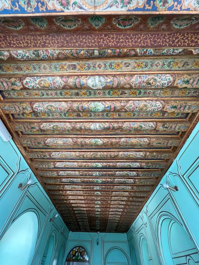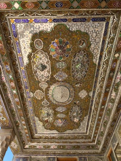 สีสัน แนวต้นไม้ และสระน้ำ นำสายตาไปสู่อาคารสองชั้นเบื้องหน้า มีทางขึ้นสองข้าง จากโถงตรงกลางที่โดดเด่นด้วยเสาหินสองต้น เพดานประดับกระจกเล่นกับแสงแดดระยิบระยับ หน้าจั่วมีภาพวาด ‘สิงโตและดวงอาทิตย์’ สัญลักษณ์ราชวงศ์การ์จา ส่วนฐานอาคารที่ยกสูงจากพื้นถึงสองเมตร ตกแต่งด้วยประติมากรรมนูนต่ำภาพสิงโตสู้กับวัว ที่อาจารย์ต้นจะไปเล่ารายละเอียดเรื่องภาพนี้ให้ฟังที่ Persepolis พรุ่งนี้