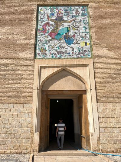 การชมตั้งต้นกันตรงกลางของทางเข้าหน้าอาคารติดประตู จุดที่เรายืนรวมตัวกันมีผนังประดับกระเบื้องสี สองข้างเล่าเรื่องการออกล่าสิงโตของกษัตริย์ ซึ่งสิงโตเป็นสัตว์ใหญ่ที่เป็นตัวแทนของอำนาจ จึงมีเพียงกษัตริย์เท่านั้นที่สามารถฆ่าได้ด้วยมือเปล่า ส่วนตรงกลางดูเด่นกว่า เป็นภาพขนาดใหญ่ของชายรับใช้สามคนที่ตามขบวนล่าสัตว์ไป ในเครื่องแบบสีสันสวยงาม