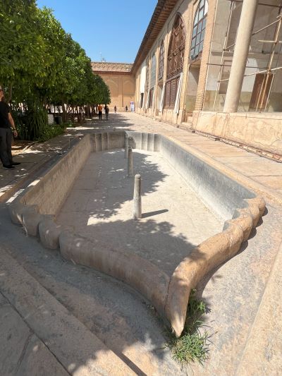 เบื้องหน้าเราคือสระน้ำทอดยาวเป็นแนว แบ่งสวนและอาคารออกเป็นสี่ส่วน มีต้นส้มที่เมื่อออกลูกเต็มที่ ต้นไม้สีเขียว จะมีลูกสีเหลืองสดใสสะพรั่งน่ามอง ด้านหลังมีต้นอินทผลสลัมคั่นเป็นแนวกับต้นปาล์มสูงที่ปลูกคู่กันมานานปี มีการทดแทนด้วยต้นใหม่เมื่อถึงเวลา เช่นเดียวกับสวนดอกไม้ข้างสระน้ำ ซึ่งเป็นลักษณะเฉพาะและสไตล์ของสวนเปอร์เซีย