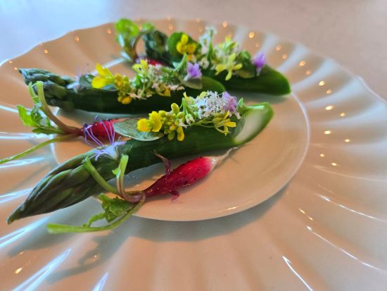 วัตถุดิบที่เป็นส่วนประกอบในคอลเลกชัน Summer Universe จะเป็นพืชผักท้องถิ่นสดใหม่ตามฤดูกาลที่ฉันรู้จักบ้าง อย่างหน่อไม้ฝรั่งขาว และไม่รู้จักบ้าง เช่น สตรอเบอร์รีเขียว ดอกกระเทียมป่า และอะไรต่อมิอะไรอีกหลายอย่าง ระหว่างเบรกที่รอนาน บริกรก็จะพาเดินเยี่ยมชมส่วนอื่นๆ ในร้าน เช่นห้องเก็บไวน์ ห้องครัวจริงซึ่งกรุผนังกระจกรอบด้าน มองเห็นการแข่งขันในสนามฟุตบอลด้านในอาคารอีกต่างหาก เก๋มากๆ