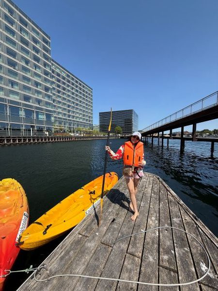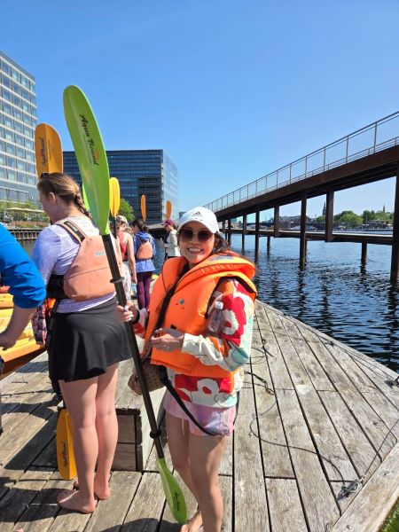 สิบโมงเช้าของวันสุดท้ายในโคเปนเฮเกน ฉันจึงพบตัวเองเดินมากับเพื่อนรุ่นน้องมาถึงท่าเรือ จัดการจ่ายเงินค่าพายเรือเสร็จสรรพ (ที่จริงต้องจองล่วงหน้ามา จ่ายหน้างานแบบนี้ไม่ได้ แต่โชคดีที่พนักงานอนุโลมให้) ด้วยความที่ว่ายน้ำไม่เป็น ฉันจึงเป็นคนเดียวในกลุ่มนักท่องเที่ยวที่จองมาพายเรือที่ต้องสวมเสื้อชูชีพ ทุกคนต้องเก็บของมีค่าไว้ในห้องล็อกเกอร์โดยครูฝึกที่จะนำพวกเราพายจะเป็นคนเก็บกุญแจห้องไว้เพื่อความปลอดภัย ส่วนตัวฉันชั่งใจแล้วว่าถ้าเก็บของทั้งหมดไว้ในห้องล็อกเกอร์ก็จะไม่ได้ถ่ายรูป ก็เลยขอเอากระเป๋าสะพายขึ้นเรือไปด้วย และอาสากับคุณเพื่อนว่าเดี๋ยวจะถ่ายรูปให้
