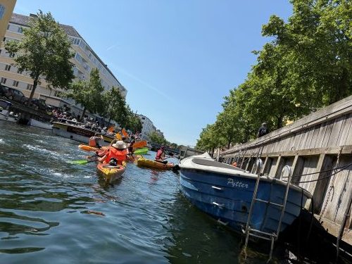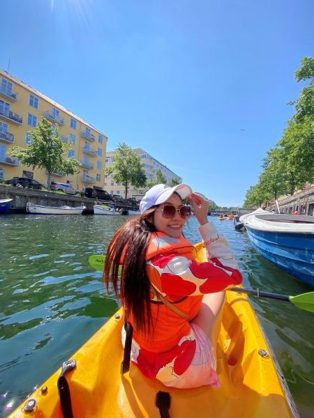 เส้นทางนั่งเรือรอบโคเปนเฮเกนในการพายคายัคครั้งนี้เป็นเส้นทางเดียวกับที่ฉันมานั่งเรือกับพี่สาวเมืองสองวันก่อน สิ่งที่เปิดมุมมองใหม่คือได้ใช้สมาธิจดจ่อกับไม้พายและใช้แรงให้เหมาะสมในการควบคุมทิศทางเรือ เสมือนได้ฝึกสมาธิและท้าทายขีดจำกัดความสามารถของตัวเองไปด้วย ภาพผู้คน บ้านเรือน ตึก อาคาร โบสถ์ พระราชวังทั้งหลายที่ผ่านคลองจักษุตอนนี้เหมือนเป็นภาพเบลอๆ เลือนๆ เป็นแบ็กกราวด์ข้างหลัง แต่ก็ยังสัมผัสถึงสายลมกระทบผิว ละอองน้ำที่กระเซ็น (และกระฉอก) สาดเปียกไปทั้งตัวเป็นระยะ แขนฉันเริ่มอ่อนล้าตั้งแต่ครึ่งชั่วโมงแรก ถามตัวเองในใจว่าจะมีปัญญาพายไปครบสองชั่วโมงไหมหนอ