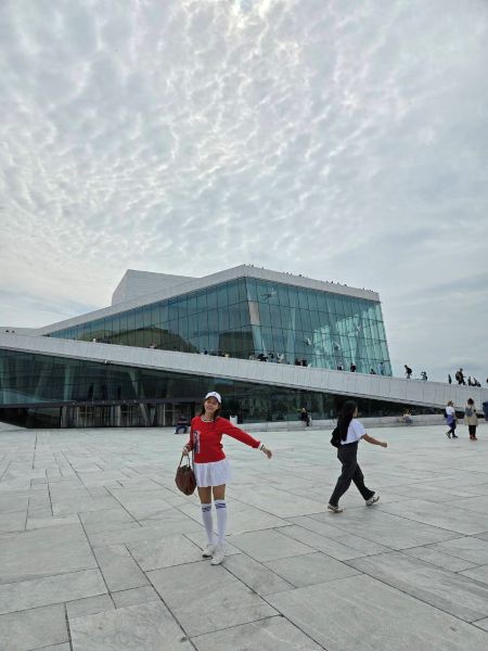 ถึงอย่างนั้น พี่สาวก็บอกฉันว่า ไหน ๆ เราก็มาออสโลแล้ว แค่แวะถ่ายรูปที่โอเปร่าเฮาส์เป็นที่ระลึกสักหน่อย เพราะเป็นทางผ่านไปมิวเซียมพอดี เราสามคนก็เลยแวะเก็บภาพหน้าอาคารสักหน่อย แล้วค่อยเดินกันต่อไปถึง Munch Museum ถึงแม้เรามาในช่วงฤดูร้อนไม่เห็นทะเลสาบน้ำแข็งเชื่อมกับตัวอาคารก็จริง แต่ก็ได้เห็นหงส์ว่ายน้ำเริงร่ากันก็เพลินไปอีกแบบ