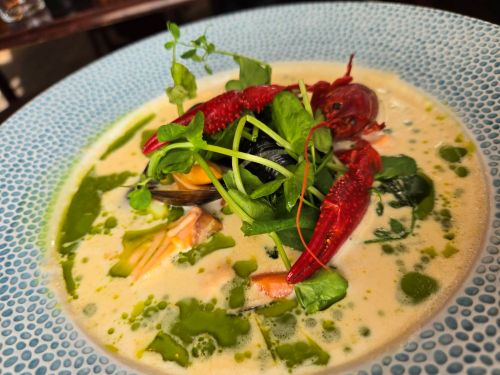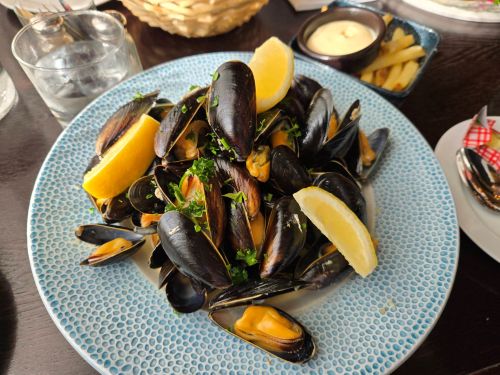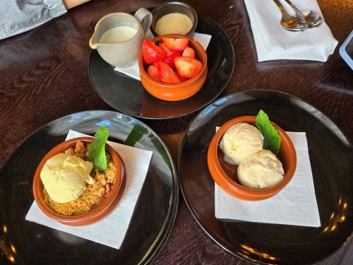 พวกเราสั่งหอยแมลงภู่ต้มซอสไวน์ อกเป็ดรมควัน ซุปลอบสเตอร์ พายรูบาร์บ และสตรอว์เบอร์รี่กับไอศกรีมคาราเมลบราวน์ชีส ชีสเฉพาะของแถบนี้ อิ่มอร่อยจุใจมาก (ราคาก็น้ำตานองหน้าเช่นกัน)