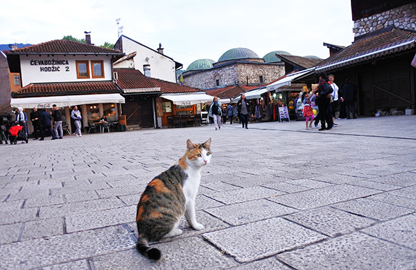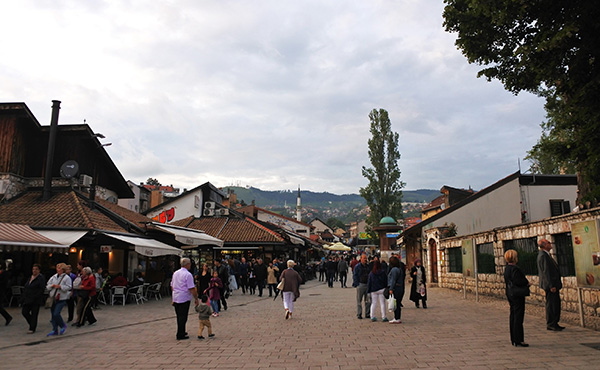 เราเดินไปบนถนนคนเดิน Bravadziluk ร้านอาหาร ร้านค้าตั้งอยู่เต็มสองฝั่ง จนมาถึงจุดที่เป็นลานกว้าง จะว่ามีลักษณะสี่เหลี่ยมผืนผ้าก็ไม่ใช่ สี่เหลี่ยมคางหมูก็ไม่เชิง เรียกบริเวณนี้ว่า Bascarsija ย่านตลาดหรือบาซาร์เก่า และเป็นศูนย์กลางทางประวัติศาสตร์และวัตนธรรมของกรุงซาราเยโวเลยก็ว่าได้ สร้างขึ้นตั้งแต่คริสต์ศตวรรษที่ 15 โดยเสนาบดีที่ขึ้นตรงกับสุลต่านแห่งจักรวรรดิออตโตมัน