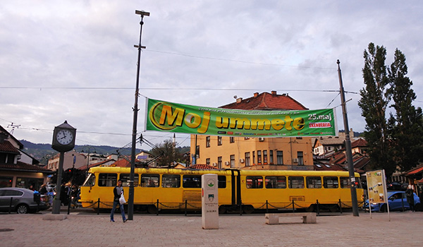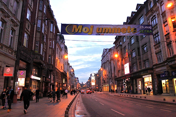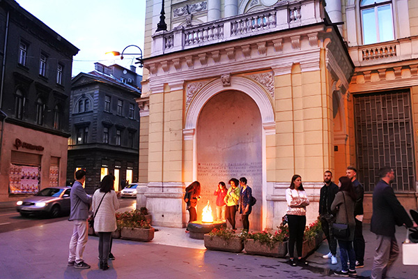 เราเดินไปจนถนน Ferhadija บรรจบกับถนนเส้นหลัก Marsala Tita ซึ่งมีรถยนต์และรถรางวิ่งสัญจร ที่หัวมุมจุดเชื่อมของ 2 ถนน ถัดจากสำนักงานไปรษณีย์ คือ Vjecna Vatra อนุสรณ์สถานรำลึกผู้เสียชีวิตในสงครามโลกครั้งที่ 2 ซึ่ง Vjecna Vatra แปลว่า “เปลวไฟที่ไม่เคยดับ”
