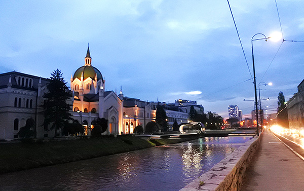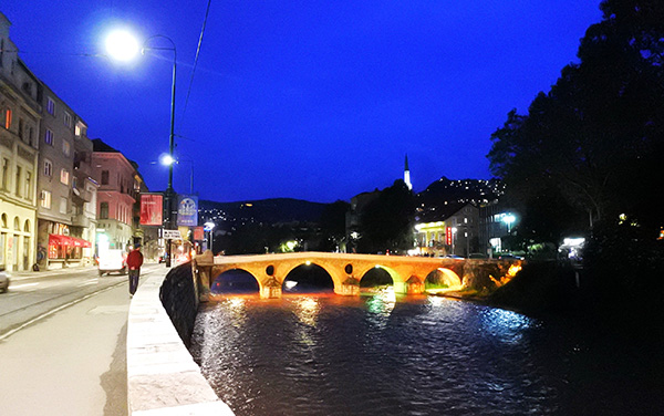 หนุ่มสาวนักท่องเที่ยวกำลังถ่ายภาพโดยมีเปลวไฟนิรันดร์และถ้อยแถลงแห่งอิสรภาพที่สลักไว้เบื้องหลังเป็นฉาก เราเดินต่อไปบนถนน Marsala Tita ได้สักพักก็เลี้ยวซ้ายเข้าถนน Radiceva ออกสู่ถนน Obala Kulina Bana ซึ่งเป็นถนนเลียบแม่น้ำมิลยัสกา (Miljacka) มีทางรถรางวางไปบนถนนคอนกรีตด้วย ฝั่งตรงข้ามคือสะพาน Festina Lente เป็นสะพานลักษณะโมเดิร์นที่มีหลังคาม้วนโค้งอยู่ตรงกลาง ออกแบบโดยสามนักศึกษาจากสถาบันวิจิตรศิลป์แห่งซาราเยโว (Academy of Fine Arts Sarajevo) สร้างเมื่อปี ค.ศ. 2012 นี่เอง สะพานนี้เชื่อมถนนและสถาบันที่ตั้งอยู่อีกฝั่งแม่น้ำ