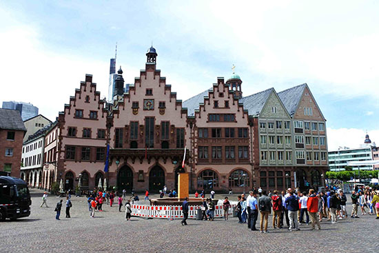 ออกจากห้าง Galeria ลุงอูเวอร์ก็เดินนำไปยังจัตุรัสตลาดเก่านครแฟรงก์เฟิร์ต ชื่อ Römerberg ใกล้ๆ สะพานเหล็กข้ามแม่น้ำไมน์ กลุ่มอาคารโบราณบริเวณนี้โดนกองกำลังทางอากาศของฝ่ายสัมพันธมิตรทิ้งระเบิดใส่ไม่เหลือซากในสมัยสงครามโลกครั้งที่ 2 หลังสงครามทางเมืองก็ได้สร้างอาคารขึ้นใหม่ให้ดูเหมือนเดิมแต่ลุงอูเวอร์บอกว่าไม่ได้เหมือนเป๊ะเสียทีเดียว ด้านขวามือคือศาลาว่าการนครแฟรงก์เฟิร์ต เรียกกันว่า Römer หนึ่งในห้องที่ได้รับความนิยมจากผู้มาเยือนคือห้อง Kaisersaal มีภาพเขียนของกษัตริย์เยอรมันในอดีตตั้งเรียงกันอยู่